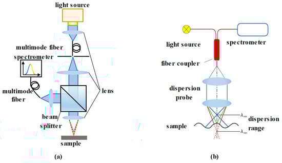 Beyond the abovementioned pinhole structures, optical fibers are also a perfect choice to act as the pinhole because of their small core diameters [,,,]. These fibers can enable size customization, low signal loss, and stable beam transmission, as shown in academic research and commercial products. As Figure 5 illustrates, the optical fibers simplify the optical path, enable modular design and allow for the easy adjustment of the measuring parameters. In Figure 5a, a single multimode fiber is used to transmit the light while acting as a pinhole. In the structure shown in Figure 5b, the fiber coupler plays the roles of a beam splitter and the pinhole.