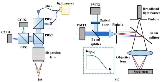 Furthermore, some studies have explored the utilization of CCDs or color cameras for reflected light analysis. LiangChia Chen [] used a polarization beam splitter (PBS) to form p-wave and s-wave beams to generate differential signals on two color CCDs (as shown in Figure 7a), after which the position could be derived from these signals by use of the proposed algorithm. Taejoong Kim [] used transmittance to obtain the wavelength distribution, as shown in Figure 7b. Photomultiplier tubes (PMTs) require little time for integration when used to realize a high measuring speed. However, these detection methods can only identify certain spectral bands, and their wavelength resolution is relatively low, impacting the displacement-measuring resolution in chromatic confocal systems.