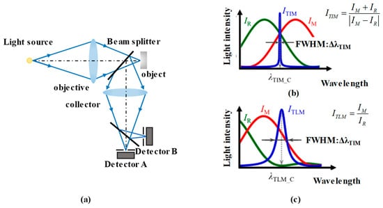 In chromatic confocal technology, the wavelength–position response curve depends on the probe’s dispersion performance. There is a tradeoff between the measurement’s resolution and its range []. Therefore, a dual-detection configuration is proposed to achieve a high-contrast signal, as shown in Figure 8a. The light reflected from the sample’s surface is divided into two beams for the two detectors. The two detected signals, IA and IB, can be used to calculate the ratio IR = IA/IB and the difference IM = IA − IB. Figure 8b,c show the two kinds of signal processing algorithms that can be applied to the target spectra to extract the confocal wavelengths []. Clearly, the algorithm in Figure 8b provides a smaller FWHM than that in Figure 8c.