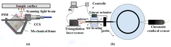 (a) The chromatic confocal sensor combined with fast steering mirror (FSM), reprinted from []. (b) The measurement system using a chromatic confocal sensor to obtain the profile of the micro gear teeth, reprinted from [].