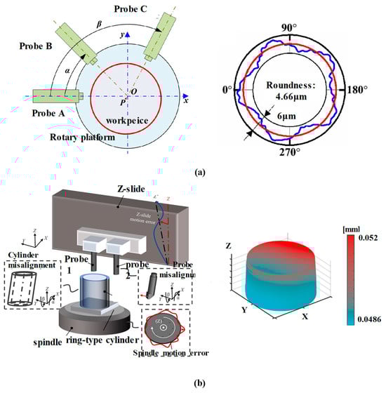 Roundness measurement. (a) Three-probe system and its measuring result, reprinted from []. (b) Dual-probe system and its measuring result, reprinted with permission from [], copyright 2022 Elsevier.
