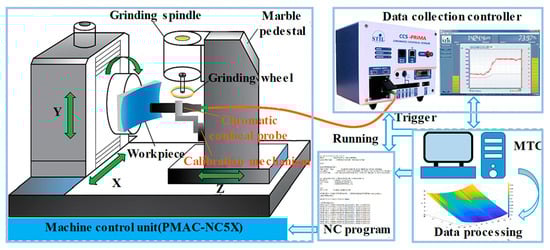 - Wang, S.; Zhao, Q. Development of an on-machine measurement system with chromatic confocal probe for measuring the profile error of off-axis biconical free-form optics in ultra-precision grinding. Measurement 2022, 202, 111825. [Google Scholar] [CrossRef]