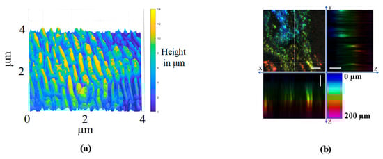 The use of chromatic confocal technology is a non-destructive measurement technique that can be applied to contour measurements in biomedicine, without applying heat to or destroying the biological tissues. Yang, X F [] used a chromatic confocal probe to scan multi-depth volumetric nude-mouse skin. As shown in Figure 13a, Qi Cui [] used a chromatic confocal sensor to achieve the three-dimensional imaging of onion slices with a height resolution of 1.3 μm. M. Zint [] utilized a chromatic confocal system with a microlens array and a pinhole array to obtain high resolution and accuracy in dental contour measurements at a reduced cost. Johnson Garzón R Kübler [] has employed a chromatic confocal sensor in lateral scanning to measure the central thickness of the human cornea and retina. Yang, X [] performed imaging of human gastric tissues. Cory Olsovsky [,] employed a non-spherical lens to achieve a dispersion range of 150 μm for the rapid three-dimensional imaging of porcine oral mucosa before cell apoptosis.