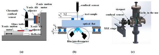 On the other hand, the film thickness of transparent samples can also be measured by use of chromatic confocal technology. The reflected light forms two peaks in the reflection spectrum, relating to the upper and lower film interfaces []. Hence, the axial position interval can be derived from two peaks to determine the film thickness []. Under this method, the refractive indexes of transparent samples influence the film thickness measurement results. In Figure 15a, an optimized model is proposed to measure the film thickness without the need to use the refractive index by employing a motor to drive the sensor and placing a reflector behind the sample. Chunmin Liu [] designed a chromatic confocal sensor for online measurement to obtain the thickness of transparent samples. Niese and Svenja [] also integrated chromatic confocal sensors into the production line to help in measuring the polymer film and tempered glass thickness. Fang Cheng [] proposed a 3D surface scanning system as a platform for the inspection of a sapphire substrate. As shown in Figure 15b, the chromatic confocal probe here obtains the position with compensation for the error produced by the interferometer. Christian Haider [] introduced a strategy to overcome the tradeoff between the thickness measurement range and the lateral resolution of a chromatic confocal sensor. Jiafu Li [] proposed a novel measurement model by adding an auxiliary transparent film into the dispersion field to avoid the use of a standard workpiece. Additionally, the thickness of the liquid film can be measured using chromatic confocal sensors. I. Eliyahu [] measured the thickness of a gallium indium free surface jet, and obtained high accuracy and resolution using low-cost, non-contact chromatic confocal sensors, as shown in Figure 15c. Jiantao Lan [] employed a chromatic confocal system to observe the evaporation dynamics of sessile water droplets under various environmental conditions, showing its potential use in experimental fluid dynamics. Beyond this, J Bai used a chromatic confocal sensor to measure the spectral reflectance of a film and fit it with the theoretical reflectance to determine its thickness []. The measurement accuracy of this approach is comparable to that of a reflectometer, and the lateral resolution is higher, enabling micro-area film thickness measurement. Similarly, Ching-Te Kuo [] et al. measured a pellicle surface by analyzing the reflected light wavelength, with an axial resolution of 22 nm.
