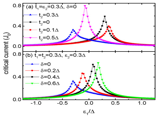 - Cheng, S.G.; Sun, Q.F. Josephson current transport through T-shaped double quantum dots. J. Phys. Condens. Matter 2008, 20, 505202. [Google Scholar] [CrossRef]