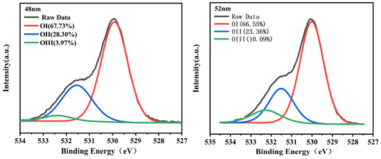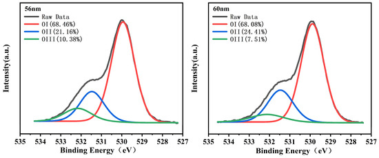 XPS analysis of thicknesses of 48, 52, 56, and 60 nm. OI represents the O bond in the metal, OII represents the oxygen vacancy, and OIII represents the oxygen in the hydroxyl group.