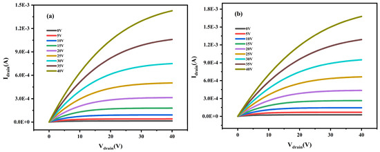 The threshold voltage (VTH) of the TFT device can be obtained by fitting the linear part of the transfer characteristic curve. The saturation mobility of the device can be obtained by fitting Equation (1), where Ci is the gate capacitance per unit area, W is a constant indicating the channel width, L is a constant indicating the channel length, and VGS and IDS are denoted as the gate voltage and drain current, respectively.