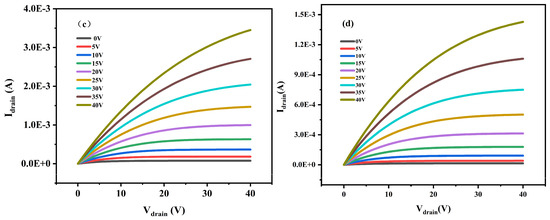 In order to analyze the electrical performance parameters of different samples, four samples were tested for electrical performance using a semiconductor parameter analyzer (B1500A, Santa Rosa, CA, USA). Figure 4 presents the output characteristic curves of four samples. As you can see from the graph, IDS is increasing as VDS increases, and as VDS gradually increases, IDS tends to be saturated. This indicates that LZTO/ZTO thin-film transistors are n-type semiconductor devices.