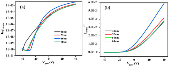 Figure 5 shows the transfer characteristic curves of VGS for four samples in the range of −40 V to 40 V. It can be seen from the figure that the transfer characteristic curve shifts when the thickness of the active layer is varied. The results show that the performance of TFTs can be greatly affected by changing the active layer thickness of ZTO/LZTO [29]. The LZTO/ZTO TFT’s electrical performance parameters extracted from Figure 5 are presented in Table 2.