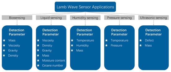 Currently, LWRs exhibit extremely high sensitivity to environmental changes due to their high Q factor and frequency stability. Their multi-mode characteristics not only enable multifunctionality in sensor applications but also optimize the overall performance. In the following sections, we will summarize the applications of Lamb wave sensors in various fields, including biosensing, liquid detection, pressure sensing, and humidity measurement.