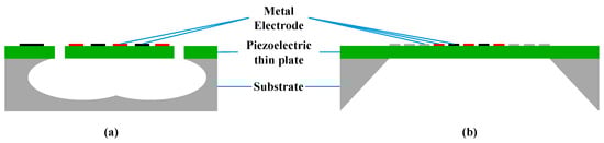 In fact, in addition to the electrode configuration on the electromechanical coupling coefficient, the fabrication process is crucial for determining LWR performance. LWR technology is similar to film bulk acoustic resonator (FBAR) technology, both of which are realized through micromachining on a piezoelectric thin plate. For the edge-type LWR, as illustrated in Figure 2a, the suspended piezoelectric thin plate edges are formed by etching using photoresist or SiO2 [] as a hard mask, ensuring vertical edges and high quality. The release of the piezoelectric thin plate can be achieved through dry etching methods using XeF₂ [,] or SF₆ [] or through the wet etching processes. For the grating-type LWR, as illustrated in Figure 2b, the standard three-step dry etching method Bosch process is typically used to etch the Si substrate from the backside, thereby isolating the device from the support layer.