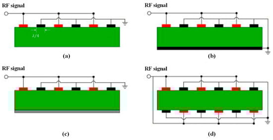 In order to enhance the performance of the resonator, various design approaches can be adopted for the interdigital electrode. Several common IDT configurations of single-port LWRs are illustrated in Figure 3, including the single-IDT electrode configuration, the IDT with a grounded bottom electrode (BE) configuration, the IDT with floating-BE configuration, and the double-IDT electrode configuration []. These different electrode configurations influence the effective electromechanical coupling coefficient () of the resonator.