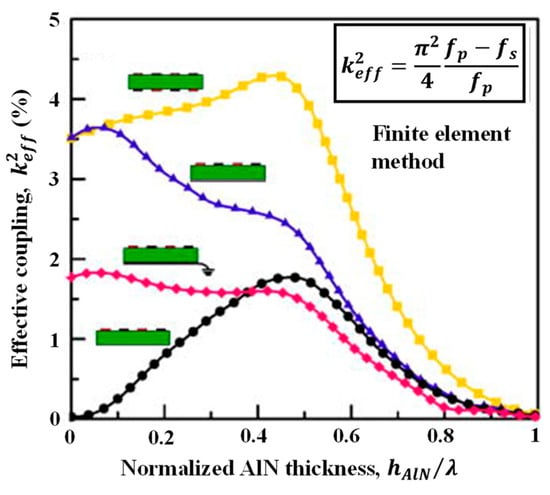 Furthermore, the is also influenced by electrode configuration, electrode materials, piezoelectric materials, piezoelectric thin plate thickness, and Lamb wave modes [,]. Jie Zou et al. [] conducted an analysis of LWR based on AlN thin films and simulated the of four different electrode configurations in the S0 mode with varying AlN thicknesses. The results indicated that under the same material and thickness ratio conditions, the double-IDT electrode configuration consistently exhibited the highest , as shown in Figure 4.