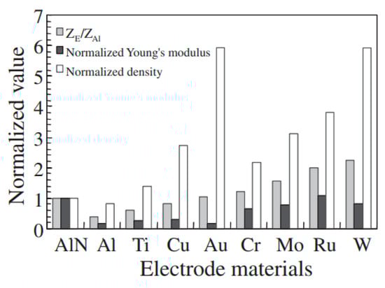 Comparison of acoustic impedance, Young’s modulus, and density for different electrode materials []. All parameter values are normalized relative to the characteristics of AlN.