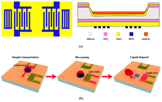 Applications of LWR biosensors: (a) electrode structure and model diagram of an inverted LWR biosensor based on ZnO/SiO2/Si/ZnO film []; (b) schematic diagram of a flexible acoustic sensor for biosensing based on LFE-TSM/Lamb wave hybrid mode [].