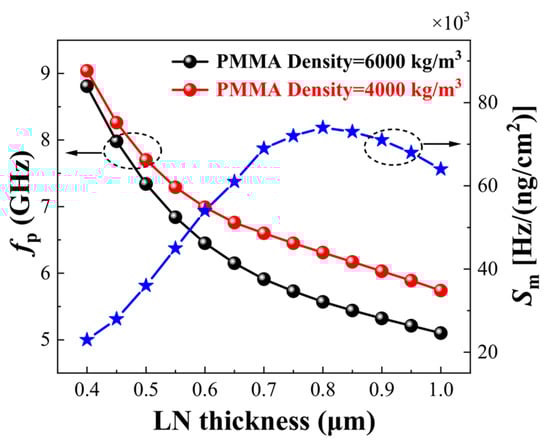 Typically, the mass sensitivity of Lamb wave biological mass sensors is related to the thickness of the piezoelectric thin plate, as shown in Figure 9. The mass sensitivity of the sensor can be optimized by adjusting the plate thickness. In fact, the thickness of the piezoelectric layer affects the mass sensitivity of the biological mass sensor while the thickness and density of the sensing layer, along with the electrode thickness, also influence the mass sensitivity of the biological mass sensor. According to Equation (11) [], the mass sensitivity is negatively correlated with the change in the thickness and density of the sensing layer. However, by keeping the thickness and density of the sensing layer constant, increasing the thickness of the electrode can enlarge the surface area of the sensing layer, thereby enhancing its mass sensitivity []. It is important to note that excessively increasing the thickness of the electrode or the sensing layer may introduce excessive damping and energy loss, which can ultimately reduce the mass sensitivity.