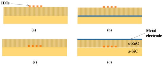 Four transducer configurations of single-port LWRs []: (a) single-IDT; (b) IDT/grounded-BE; (c) IDT/floating-BE; (d) double-IDT.