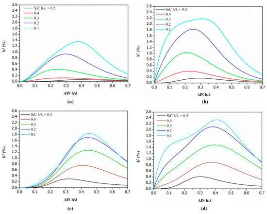 Based on current research [,,,], regardless of whether ZnO or AlN are used and regardless of variations in the thickness-to-wavelength ratio (h/λ), both sTfm and smfT structures exhibit high effective electromechanical coupling coefficients. However, increasing the thickness of the SiC layer will reduce the electromechanical coupling coefficients. For instance, Figure 11 illustrates the k² dispersion curves for four coupling configurations in c-AlN/SiC(001)<100>.