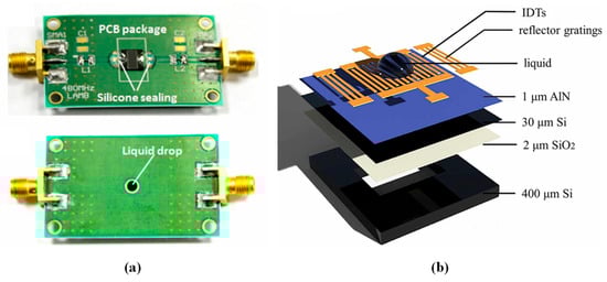 The working principle of the Lamb wave liquid sensor can be described by Equation (12) []. When liquid is dripped onto the sensor surface, the resonant frequency changes, with the frequency offset primarily determined by the density and viscosity of the liquid.
