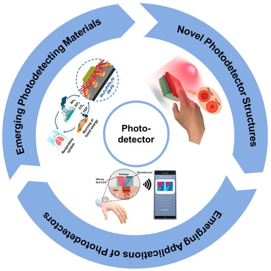 The development of photodetectors has experienced transformative progress, largely driven by significant advancements in material science. These breakthroughs, particularly in the synthesis of novel materials, have led to a new generation of photodetecting devices with enhanced optical, electrical, and mechanical properties [,,,]. The continuous exploration of emerging materials, such as perovskites, organic polymers, two-dimensional (2D) materials, and quantum dots, has opened up avenues for creating high-performance photodetectors that not only surpass conventional technologies but also introduce entirely new capabilities. These materials exhibit unique properties that offer flexibility in design and functionality, allowing for the tailoring of photodetectors to meet the stringent requirements of various modern applications.