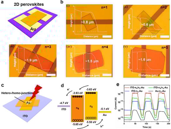 Perovskites, particularly lead-halide perovskites (ABX3), have attracted considerable attention due to their exceptional optoelectronic properties, including high absorption coefficients, long carrier diffusion lengths, and tunable bandgaps [,]. Their synthesis methods, such as solution processing, vapor deposition, and spin coating, allow for low-cost and scalable production, making them ideal for large-area photodetector applications [,,,,,]. Recent research has focused on improving the stability of perovskites, which tend to degrade under environmental factors like moisture, heat, and light exposure []. By incorporating additives, passivation techniques, and improved encapsulation, researchers have enhanced the operational stability of perovskite photodetectors. Furthermore, the bandgap tunability of perovskites allows for the detection of a broad spectrum of light, from ultraviolet to near-infrared (NIR), making them versatile candidates for multi-spectral photodetectors. Hong et al. introduced a surface tension-dominant crystallization technique for developing single perovskite crystals, which were employed in vertically oriented hetero-/homojunction photodetectors, as illustrated in Figure 2 []. Halide perovskites, particularly of the Ruddlesden-Popper (RP) type, exhibit remarkable optoelectronic properties, including high absorption coefficients, tunable bandgaps, and strong quantum confinement effects. These attributes are key to enhancing the performance of photodetectors. The study utilized composition engineering to optimize the quantum well index, and it was observed that perovskites with a quantum well index of n = 4 delivered superior performance metrics. Specifically, these perovskite-based photodetectors exhibited an enhanced photocurrent, a diminished dark current, and an on/off ratio exceeding 3.5 orders of magnitude. Additionally, the study found that when operating in a self-powered mode, these photodetectors maintained high sensitivity and low power consumption, making them suitable for next-generation optoelectronic applications. The vertical junction structure played a crucial role in enhancing light absorption and charge separation, contributing to the overall efficiency of the device [].
