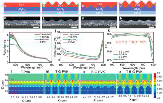 Characterization of light-trapping capability. (a–d) Schematic structure. (e–h) Cross-sectional SEM images, blue dashed lines marks the edge of PVK films. (i–k) Absorbance spectra, reflectance spectra, and light-harvesting efficiency. (l–o) Field plots of time-averaged electromagnetic energy density with respect to the x–z plane at the wavelength of 650 nm of F-PVK, T-G-PVK, B-G-PVK, and T-B-G-PVK films. T-B-G-PVK exhibits the highest light-harvesting capability [].