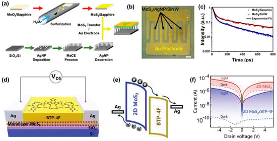 (a) Schematic illustration of the fabrication process of the bilayer MoS2, silicon nanowire, silver nanoparticle, and hybrid photodetector. (b) Optical image of the hybrid MoS2 device. Scale bar, 100 μm. (c) Normalized TRPL decay of bilayer MoS2 on SiNW and sapphire substrates. The exponential fits of both trends are shown with a black solid line []. (d) An illustration of the monolayer MoS2/BTP-4F device. (e) The energy-level marching for the monolayer MoS2 and BTP-4F film at the VDS of 5 V. (f) The I–V curves corresponding to the pure MoS2 and MoS2/BTP-4F devices, respectively [].