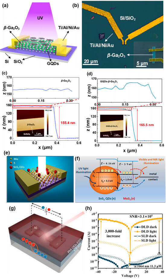 Fabrication and characterization of bare β-Ga2O3 and GQDs/β-Ga2O3 PDs. (a) Schematic diagram of the hybrid GQDs/β-Ga2O3 PD under light illumination. (b) Optical microscope image of the fabricated β-Ga2O3 device after annealing with the SEM image of the effective area of the β-Ga2O3 flake, as shown in the inset. (c) AFM images of the bare β-Ga2O3 device (left) and (d) the GQDs/β-Ga2O3 device (left) with a cross-sectional height profile (right) along the white dashed line depicted in the AFM images of (c,d). The enlarged images in (c,d) reveal that the size of these GQDs is ~10.1 nm []. (e) A 3D schematic representation of the MoS2/SnS2 QDs heterojunction. (f) Schematic illustration of the SnS2-QDs and monolayer MoS2 band structure after the formation of a heterojunction with proposed (e–h) pair separation []. (g) A 3D scheme of the a-IGZO/PbS QDs heterojunction device. (h) I–V curves under dark and NIR light (@1064 m, 11.3 μW) of the a-IGZO/PbS QDs heterojunction device and the PbS QDs-EDT film-only device [].
