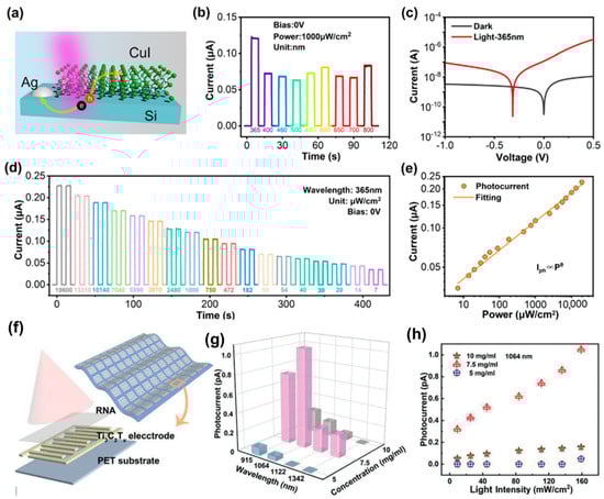 (a) Schematic diagram of the CuI/Si photodiode. (b) Time-resolved photoresponse of the device at 0 V bias under illumination with different monochromatic light wavelengths. (c) Current–voltage characteristics of the CuI/Si photodetector in the dark and under illumination with 365 nm light at 1000 μWcm−2. (d) Transient responses of the CuI/Si photodetector under various light intensities of 365 nm light at 0 V bias. (e) Light–power-dependent photocurrent of the photodetector under 365 nm light irradiation at 0 V bias []. (f) Schematic diagram of a single Ti3C2Tx-RAN PD structure. (g) Photocurrent curves of devices with concentrations of 10, 7.5, and 5 mg mL−1 at 915, 1064, 1122, and 1342 nm. (h) Plots of photocurrent changes with different optical power densities for devices with concentrations of 10, 7.5, and 5 mg mL−1 at a wavelength of 1064 nm [].