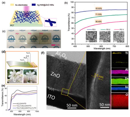 (a) Schematic illustration of the Ag NW@S-ZnO NR-based UV detector. (b) UV–Vis optical transmittance spectra of Ag NW@S-ZnO NR thin films with different drop-coating times. The insets are corresponding SEM images of the Ag NW@S-ZnO NRs network of PD1, PD2, and PD3. (c) Appearance of Ag NW@ZnO NR film on HIT-logo paper []. (d) Schematic diagram of the Ti3C2Tx/Al2O3/ZnO/Ti3C2Tx/ITO/PET device, accompanied by digital images of it. (e) Transmittance profiles of the ZnO-based flexible photodetector with and without Ti3C2Tx. (f) Cross-section TEM image of the Ti3C2Tx/Al2O3/ZnO/Ti3C2Tx/ITO/PET device, along with elemental mapping profiles of Ti, Al, Zn, In, and O [].