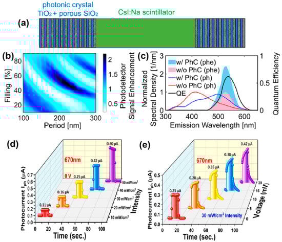 (a) Schematic diagram of the CsI:Na scintillator with a PhC cavity (TiO2 + porous SiO2). The TiO2/SiO2 PhCs have been shown to be feasible in previous work. Here, we replace the SiO2 film with a porous SiO2 material so as to achieve a low refractive index (1.06) for the SiO2 layer. The porous SiO2 material can be realized by random SiO2 nanorod arrangement. (b) Photodetector signal enhancement vs. period and filling factor of the photonic crystal. (c) Spectral density of photons (ph) and photoelectrons (phe) with optimized configuration of the PhC cavity (TiO2 + porous SiO2). The emission spectrum is shifted to a longer wavelength to match the quantum efficiency spectrum of the photodetector []. (d) The pulse photoresponse of the photodetector for red light with varying intensity at non-biased and self-biased conditions. (e) Different bias voltages at a 30 mW/cm2 intensity [].