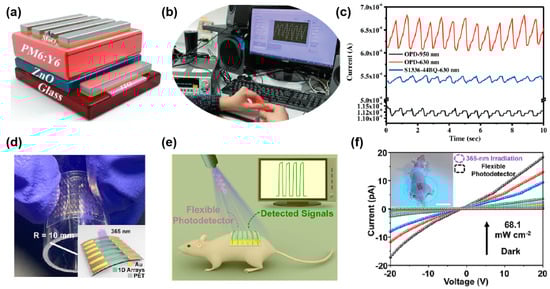 As shown in Figure 10a–c, Yu et al. developed ambient-stable near-infrared organic photodetectors (OPDs) with ultrahigh detectivity and ultrafast response, primarily targeting applications in biometric monitoring, such as real-time heart rate measurement []. The flexible and lightweight OPDs were designed using organic photovoltaic materials, offering ease of integration into portable and wearable devices. The results demonstrated the potential of these OPDs for healthcare applications by achieving a high detectivity of 3.1 × 1013 Jones and a fast response time of 220 ns under ambient conditions, which makes them ideal for continuous biometric monitoring. These devices can monitor subtle changes in light absorption caused by blood flow, such as in photoplethysmography (PPG) for heart-rate monitoring. Zhang et al. developed ultraviolet photodetectors based on polymer microwire arrays designed for use in wearable medical devices, as illustrated in Figure 10d–f []. These flexible photodetectors are specifically tailored to monitor UV exposure on the skin in real time, making them ideal for continuous health-monitoring applications. The device leverages the high mechanical flexibility of the polymer microwire arrays, which allows it to maintain 97% of its original performance even after 4000 bending cycles, demonstrating its durability for wearable applications. These devices can be easily integrated into wearable technologies, making them a promising solution for next-generation health-monitoring systems, ensuring both comfort and reliability in medical applications.