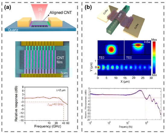 Photodetectors are also critical in optical interconnects within data centers, where they facilitate communication between processors, memory modules, and storage systems. As the size of data centers grows, the need for efficient and scalable interconnect technologies becomes more pressing. Optical interconnects, which rely on photodetectors to convert optical signals into electrical signals, offer a significant advantage over traditional copper-based interconnects due to their higher bandwidth and lower energy consumption [,,]. By integrating photonic technologies into these interconnect systems, data centers can handle more data with greater energy efficiency, thus supporting the ever-increasing computational demands of modern applications such as artificial intelligence, machine learning, and big data analytics. Wu et al. developed a high-speed carbon nanotube (CNT) photodetector for the 2 μm communication band, as shown in Figure 12a []. The device leverages the unique electrical properties of CNTs to achieve efficient photodetection, with a responsivity of 0.62 A/W and a 3 dB bandwidth of 40 GHz. The CNT photodetector outperforms conventional photodetectors in bandwidth, particularly in the 1.55 μm and 2 μm communication bands, which are critical for next-generation optical communication systems. These advancements make CNT photodetectors ideal candidates for high-speed data transmission and on-chip sensing in optical communication systems, as well as in imaging and sensing applications requiring rapid response times and high bandwidth. As illustrated in Figure 12b, Tamalampudi et al. developed a high-speed waveguide-integrated InSe photodetector on a silicon nitride (SiN) platform for NIR communication applications []. The device leverages the strong light absorption of InSe and the low-loss properties of the SiN waveguide to efficiently convert optical signals into electrical signals at high speeds. The photodetector achieves a photoresponsivity of 0.38 A/W and operates with a 3 dB bandwidth of 85 MHz, supporting data rates of up to 1 Gbps. The device exhibits a low dark current and high signal-to-noise ratios, making it suitable for high-speed optical communication and data processing. By integrating InSe into the SiN platform, the photodetector demonstrates enhanced dynamic response and compatibility with existing photonic circuits, offering significant potential for use in LiDAR, optical interconnects, and on-chip optical systems.