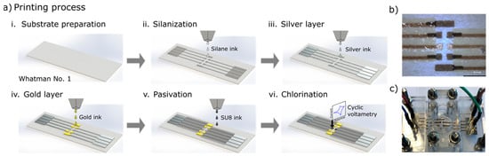 The printing process for the microelectrode on paper substrate is illustrated in Figure 1a. First, to create a hydrophobic surface for the electrodes, silane ink was printed (a.ii). This was followed by printing a layer of Ag ink for conductivity elements such as track and pads, and to create the RE (500 × 500 µm) with a drop spacing (DS) of 20 µm (a.iii). The silver elements were then fried at 80 °C for 15 min. The fourth step was printing the gold elements, which are the four Au WEs 800 × 800 µm and the two Au CEs 800 × 3000 µm with a DS of 15 µm (a.iv). The Au ink was then fried before the entire electrode was sintered in the oven at 140 °C for 60 min. To define the active areas of the microelectrode and the pads used to connect them, the areas of the Ag tracks that needed isolation were printed over with the dielectric ink SU-8 (a.v) with a DS of 15 µm. This ink was first cured with a soft bake on a hot plate at 100 °C for 5 min, then it was treated under UV light for 30 s to polymerize the layer with polymer cross-linking. The final result can be seen in Figure 1b.