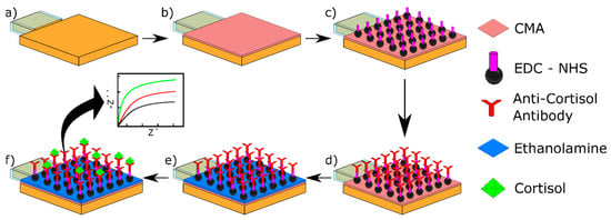 Schematic recreation of the bio-functionalization of a WE (a) representation of an activated gold electrode, (b) electrodeposition of CMA on gold WEs by applying CV, (c) CMA activation by incubation of mixture EDC/NHS, (d) bio-functionalization through incubation with anti-cortisol antibodies, (e) deactivation of the remaining active groups by incubation in ethanolamine solution, (f) incubation of the platform into cortisol solution followed by detection of cortisol by EIS.