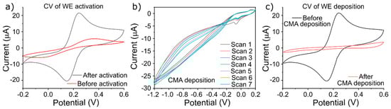 CV of ferro/ferricyanide redox cyclovoltammograms of (a) before and after activation of Wes, (b) CMA electrodeposition, and (c) before and after CMA electrodeposition.