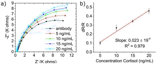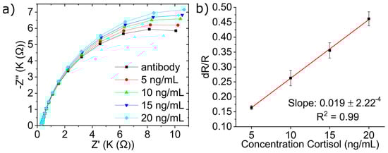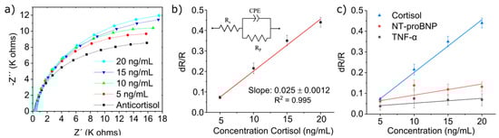 To study the sensor’s sensitivity to cortisol, the Nyquist plot semi-circles were fitted with Randles equivalent circuit model (Figure 4b inset). This is the most common model for EIS in the literature that represents the behavior seen in the measurement (the resulting semi-circles) []. When applied, it has an error rate of <1%.