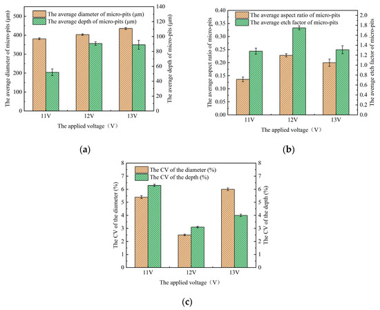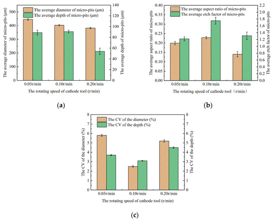- The optimal electrochemical machining parameters are 0.5 wt% C6H5Na3O7 + 10 wt% NaNO3 mixed electrolyte, a 12 V applied voltage, and a 0.1 r/min rotating speed of the cathode tool; we ascertained this through the comparative analysis of the geometric morphology and geometric size distribution of the micro-pit arrays under the corresponding process parameters. Under these conditions, the machined micro-pit arrays achieved a diameter of 405.85 ± 9.45 μm, a depth of 87.5 ± 8.5 μm, an average aspect ratio of 0.22, an average EF of 1.67, the CV of the diameter of 0.01, and the CV of the depth of 0.06.