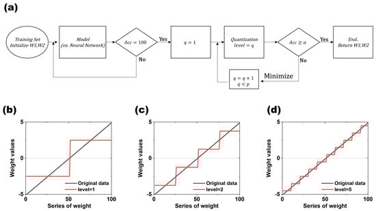 Figure 2b–d are the result of the quantization dependent on level (q) (q = 1, 2, and 4). The black line is the original value, and the red line is the value after the quantization. As the level (q) increases, the number of steps increases, which makes the difference between the values before and after the quantization smaller. The level (q) serves as the target value for converting weights from their original analog form to the discrete values aimed for during quantization. The weight range represents the difference between the minimum and maximum values of W, expressed as the sum of W1 and W2 (Equation (2)). The interval is defined as the weight range divided by the desired level (k), indicating the range of values represented by each single level (Equation (3)). The value quantizing the actual range value at level(i, middle) is then determined by multiplying the interval by a value of i + 0.5 and m i n (Wtotal) (Equation (4)).