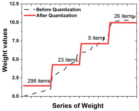 where, i is the number of levels. Equations (1), (3), and (4) are used when the list of values being quantized consists of only positive numbers greater than zero. In this case, “Weight rangeA” in Equation (3) and “Weight range” in Equation (1) have the same value because all the numbers are positive. Conversely, if the list of values being quantized contains both positive and negative numbers, “Weight rangeA” is used to set the interval.