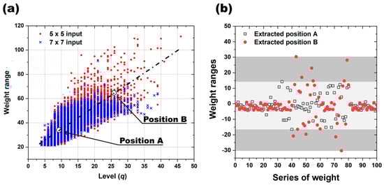 The existing quantization technique offers the advantage of converting the single-precision floating point (FP32) to a half-precision floating point (FP16) or normalizing the layer []. This technique reduces the number precision by decreasing the calculation bits while maintaining the range, aiming to cut the memory use and computational complexity. Split into FP32 and FP16, FP32 employs 32 bits, while FP16 uses 16 bits. FP16 offers reduced memory and increased throughput in software but minimal advantages in hardware, where FP32 and FP16 provide no practical benefits. To address this, our proposed quantization technique emphasizes actual hardware device implementation, simplifying the model’s weight into a straightforward list of values. Notably, our study focuses on minimizing the unique weights by setting a low level and conducting quantization. Therefore, in order to reduce the level, the correlation was investigated using the concept of weight range mentioned above. Figure 4a presents the outcomes of an experiment aimed at determining the optimal levels for various weight ranges. The initial weights were seeded from one to sixty, and 100 iterations were conducted to generate 6000 distinct models for 5 × 5 and 7 × 7 inputs, respectively. The correlation between the weights employed in each model and the resulting number of levels in the final weights was examined. The number of levels in the final weights was defined as the point at which the recognition rate reached 100%, denoted as q when α is 100% in Figure 2a. Notably, the minimum level achievable for the quantized levels (q) appears to be directly proportional to the weight range. For both the 5 × 5 and 7 × 7 input systems, models with α satisfying 100% are found at q = 4, and it has been observed that weight ranges have significantly lower values of q around 21. An interesting aspect is the phenomenon of having the same weight range but different values of q level. This suggests that there are other factors that determine the level of q along with the weight range. For models with a weight range greater than 60, the value of q is determined between 10 and 40. The points A (8, 32) and B (25, 62), shown in Figure 4a, were plotted in Figure 4b for a representative model with weight ranges of 32 and 62. As already mentioned in Figure 3, the weights of the 6000 models used in this experiment are mostly clustered around zero, and this trend becomes more pronounced as the weight range increases.