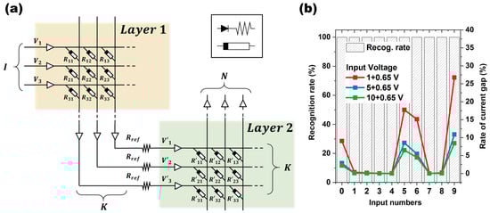 So far, it has been shown through neural network calculations that a 100%-digit recognition rate can be obtained by using the relationship between weight range and quantization level q. The device simulation for an actual device chipset was completed via PDK. The PDK simulation was performed by selecting the weight that converges to the lowest q level of 4 in the computational calculation. The circuit is shown in Figure 6a, where the input is represented by voltage and the output is represented by current. Compared to Figure 1, I is mapped to i, K to k, and N to n. Between layers 1 and 2, a reference resistor is used to convert the current to voltage and to compensate for the current. In Figure 6, the reference resistors used for each line are all the same. To check the influence of the threshold voltage of the diode added to prevent sneak current, the difference between the recognition rate and the output current as a function of the magnitude of the input voltage was compared through circuit simulation. Figure 6b shows the accuracy of the recognition rate for the final output of the PDK simulation and the difference between the current computed by the neural network and the PDK computation. The accuracy shows the digit recognition rate for 10 different inputs (0–9), with a 100% recognition rate for all the input values. This experiment shows that even a system consisting of only four weights, which is reduced to four by quantizing the weights when building a chip that runs on a real device, can still provide reliable digit recognition. The rate of the current gap shown in Figure 6b represents the difference between the output current from the PDK simulator for device fabrication and the computational calculation for the neural network. The graph shows that the input number “9” has the rate of current gap 27% (red line in Figure 6b, using a 1 V input voltage). It can be seen that input numbers 0, 5, and 6, including 9, have more than 10% gaps regarding the output value compared to the computational neural network calculation. These gaps are the difference between the calculated output current value and the current value in the PDK simulation for driving the actual device, so they do not contribute much to the decrease in recognition rate. This trend was similar when increasing the data representing the input numbers (increasing the input information in 5 × 5 inputs). This shows that the output current value maintains a certain margin, ensuring accuracy even in different environments (gaps generated by random sources; in this case, gaps generated by device fabrication).