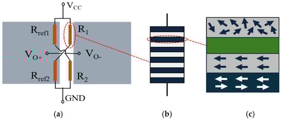Structural diagram of TMR micro-magnetic sensor: (a) TMR micro-magnetic sensor; (b) magnetic resistor; (c) magnetic tunnel junction.