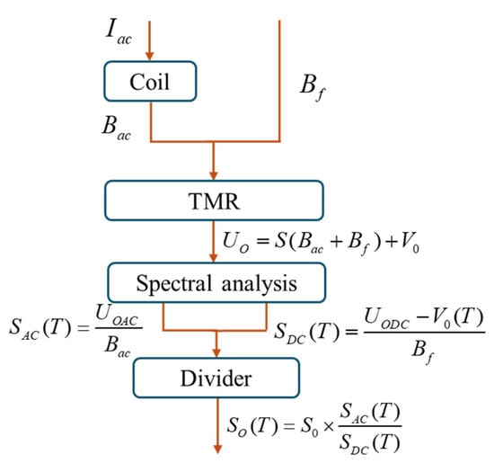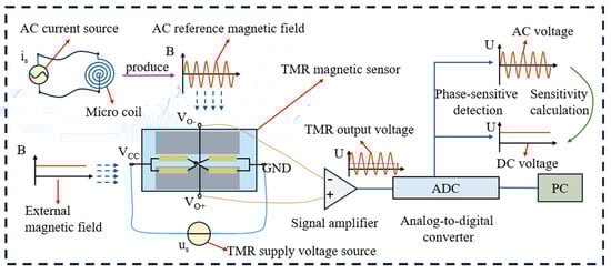 The sensitivity of a TMR magnetic sensor is characterized as the ratio of the change in output to the corresponding change in input. Variations in temperature can lead to sensitivity drift in the sensor. The sensitivity drift of TMR magnetic sensors ranges from several hundred to several thousand ppm/°C, and traditional temperature compensation methods provide limited effectiveness, making them insufficient to meet the demands of high-precision measurements. In this method, an alternating current (AC) source is employed to apply a consistent AC to a miniature coil, which in turn generates a stable AC magnetic field at the same frequency. This magnetic field, in conjunction with the external magnetic field, exerts an effect on the TMR sensor. The output signal from the TMR sensor is subsequently amplified using an amplifier, and the resulting signal is collected by a data acquisition card. Through the process of phase-sensitive detection, an AC voltage signal corresponding to the reference magnetic field frequency is isolated. By analyzing this AC output signal, the real-time sensitivity drift of the TMR sensor can be determined. This drift is then utilized to adjust the output of the TMR sensor in response to the target magnetic field, thereby facilitating temperature compensation for the TMR sensor. The principle underlying the temperature drift compensation of the TMR sensor is depicted in Figure 2.