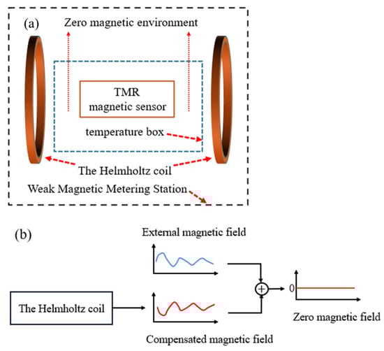 Schematic diagram of the process for achieving a zero magnetic field environment around the TMR sensor. (a) Schematic diagram of the devices that achieve a zero magnetic field. (b) Schematic diagram of the process to achieve a zero magnetic field.