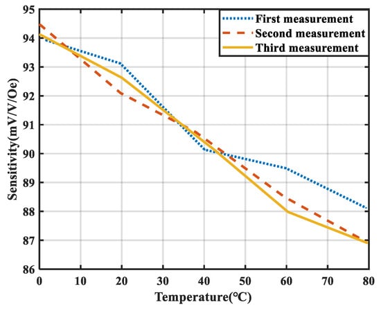 The sensitivity drift of the TMR magnetic sensor under varying temperature conditions significantly impacts the accuracy of its measurements. The temperature of the environmental chamber was adjusted within the range of 0 °C to 80 °C, with measurements performed at 20 °C intervals. Three sets of independent and repeatable experiments were conducted under identical conditions to assess the sensitivity. The test results are shown in Figure 7.