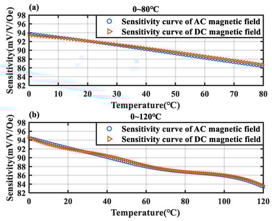 Figure 8a shows the AC and DC sensitivity curves of the TMR magnetic sensor across the temperature range from 0 °C to 80 °C. Figure 8b shows the sensitivity curves across the temperature range of 0 °C to 120 °C. It can be observed that the DC and AC sensitivities of the TMR magnetic sensor remain consistent across temperature variations, with the maximum deviation not exceeding 0.44 mV/V/Oe. Therefore, the method of replacing DC sensitivity with AC sensitivity calculated by an AC reference magnetic source in this scheme is feasible.