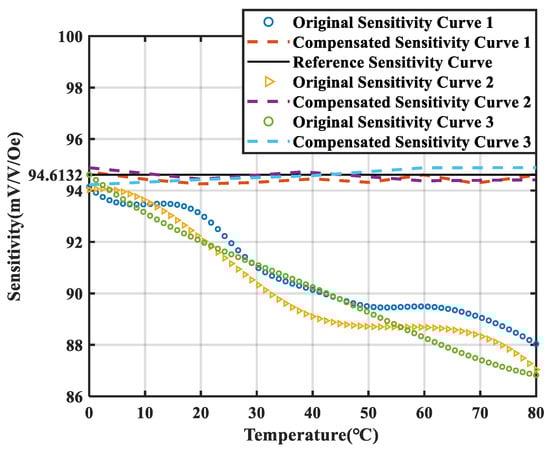 The different sensitivity drift curves in the range of 0–80 °C and the curves obtained by temperature compensation of the AC reference magnetic source.