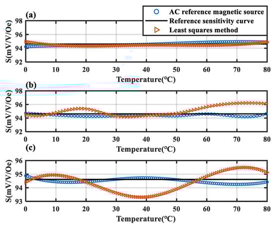 The black line is the sensitivity reference line measured at 0 °C. It can be observed that the linearity and repeatability of the TMR sensitivity curves measured in the three experiments are relatively poor. Following compensation with the AC reference magnetic source, the sensitivity of the TMR sensor remains stably at the reference sensitivity measured at 0 °C under variable temperature conditions. The sensitivity error of the compensated TMR magnetic sensor is constrained within a range of −0.41% to 0.28%. Using the data from the green curve in Figure 9 as the sample, the least squares method in traditional software compensation was applied to fit the temperature compensation curve. The fitted curve was then used to compensate the remaining two curves. The compensation results were compared with the compensation effect of the temperature compensation method under the reference magnetic source, as shown in Figure 10.