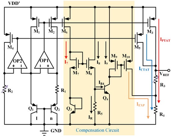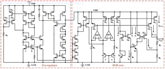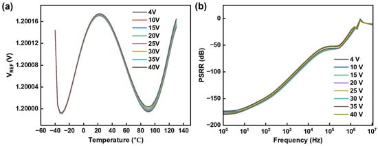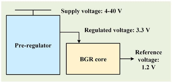 Due to its low TC and high power supply rejection ratio (PSRR), the BGR voltage source, serving as a fundamental component in integrated circuits, has been extensively utilized in DC–DC converters, analog-to-digital converters, low-dropout regulators, and other mixed-signal applications [1,2,3]. However, the large variation in the supply voltage range can lead to fluctuations in the reference voltage provided by the BGR, consequently impacting circuit operation. High performance BGRs with a wide input range (e.g., 4–40 V) are extensively applied in high-voltage integrated circuits, including smart grids, energy storage systems, and electric vehicles [4].